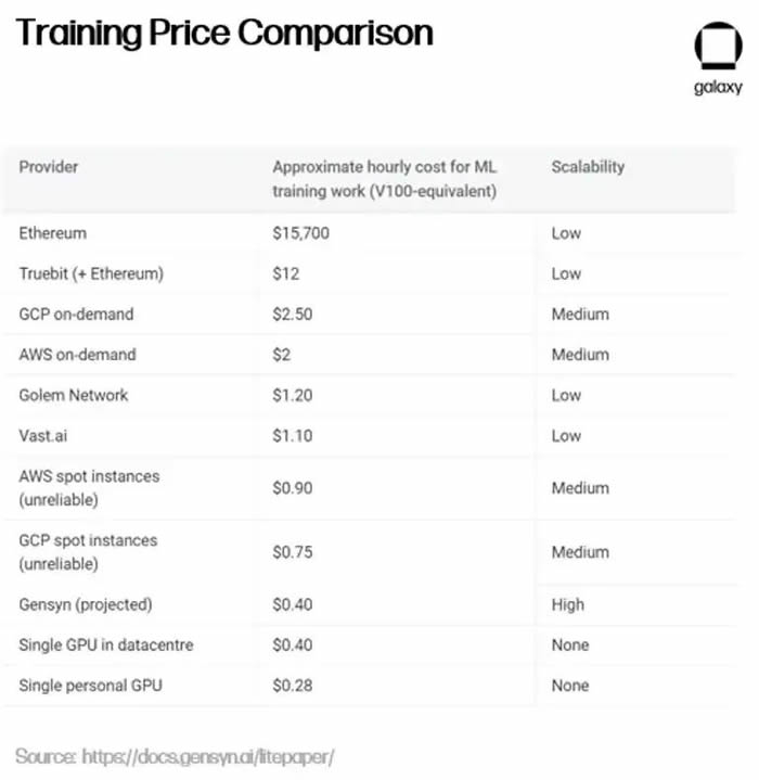 除了可以满足人工智能需求的通用计算平台外,还出现了一系列专注于机器学习模型训练的专用 AI GPU 提供方。例如,Gensyn 正在「协调电力和硬件来构建集体智慧」,认为「如果有人想训练某些东西,而有人愿意训练它,那么应该允许进行训练。」