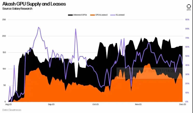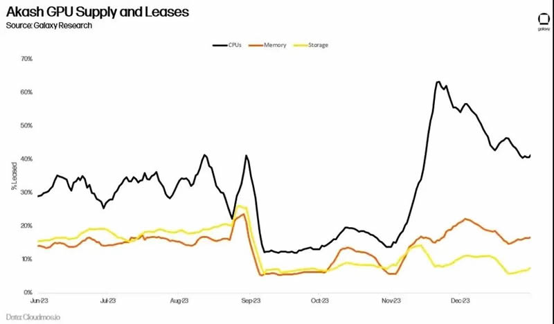 目前尚不清楚,对用于 AI 训练的 GPU 的需求激增是否会转化为 Akash 网络的长期使用量。长期以来,Akash 一直为 CPU 提供了一个市场,例如,以 70-80% 的折扣提供类似于中心化替代方案的服务。然而,更低的价格并没有导致显著的采用。网络上的租赁活动已经趋于平缓,2023 年第二季度的平均计算资源利用率仅为 33%,内存利用率为 16%,存储利用率为 13%。尽管这些对于链上采用来说是令人印象深刻的指标(作为参考,领先的存储提供商 Filecoin 在 2023 年第三季度的存储利用率为 12.6%),但这表明供应继续超过对这些产品的需求。