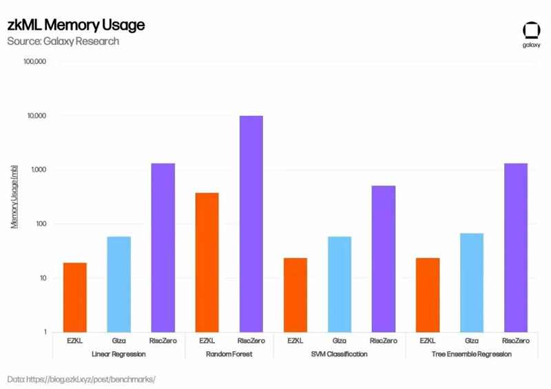 在过去几个月中,EZKL 在增强其 zkML 解决方案方面取得了显著进展,主要集中在降低成本、提高安全性和加速证明生成方面。例如,在 2023 年 11 月,EZKL 集成了一个新的开源 GPU 库,将总体证明时间减少了 35%,并且在 1 月份,EZKL 宣布了 Lilith,这是一个软件解决方案,用于在使用 EZKL 证明系统时集成高性能计算集群并协调并发作业。Giza 独特之处在于,除了提供创建可验证机器学习模型的工具之外,他们还计划实现 Hugging Face 的 web3 等效版本,为 zkML 协作和模型共享开设一个用户市场,并最终集成去中心化的计算产品。在 1 月份,EZKL 发布了一个基准评估,比较了 EZKL、Giza 和 RiscZero(下文讨论)的性能。EZKL 表现出更快的证明时间和内存使用率。