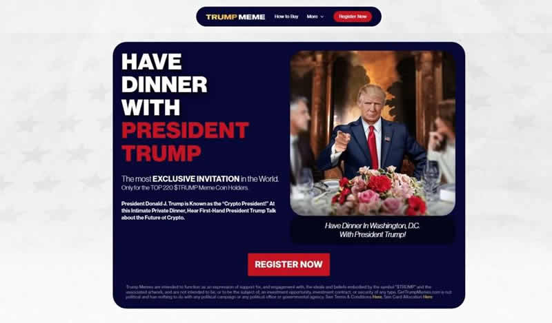 该迷因币官网指出,TRUMP 代币持有者将获得与美国总统川普共进晚餐的机会,其中前25 名还将获得「总统的超级专属私人贵宾招待会」和「特别VIP 之旅」。