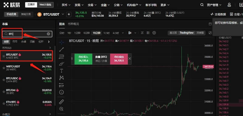 8、在搜索框输入BTC,选择BTC/USDT交易对,可以看到BTC实时行情