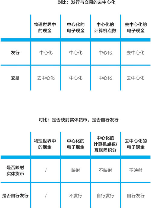 按前面的对比表格,这种理想化的去中心化的电子现金几乎在每个方面都试图进行突破:不映射线下的货币,而在数字世界中自行发行;发行去中心化,不需要一个类似中央银行的角色;像物理世界中的现金交易一样,交易无须中介介入。