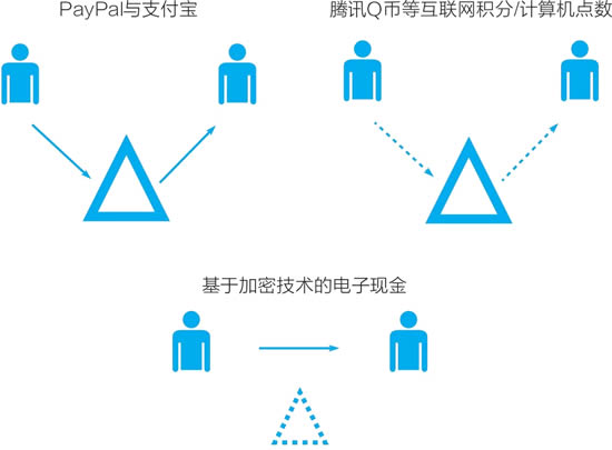 现在,被互联网用户广泛使用的主流支付系统是 PayPal、支付宝,以及后来出现的移动支付 Square、微信支付等。这些第三方在线支付系统依赖于物理世界中的货币系统与金融体系,它们在数字世界中为用户提供支付、转账等服务。在使用它们时,我们所用的钱是物理世界中的法币,如美元、人民币、欧元、日元等,钱从银行账户中被映射到网络支付账户中。