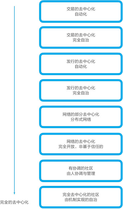 在去中心化的程度上,比特币系统达到了极致。去中心化的初级阶段是自动化(automatic),即根据人设定的规则自动运行,而去中心化的高级阶段是自治(autonomous),也就是完全自治、自发。而比特币系统作为一个电子现金系统,达到了极致的去中心化状态(见图 3):