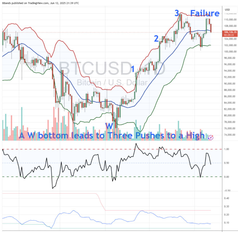 自4月以来,比特币(BTC)价格多次在上方布林带受阻。该指标的创造者现在认为局部上涨趋势可能完全结束。比特币多头在6月面临来自多个方向的阻力。比特币(BTC)在110,000美元处受阻后,显示出局部上涨趋势可能结束的信号,一位知名的交易分析师表示。